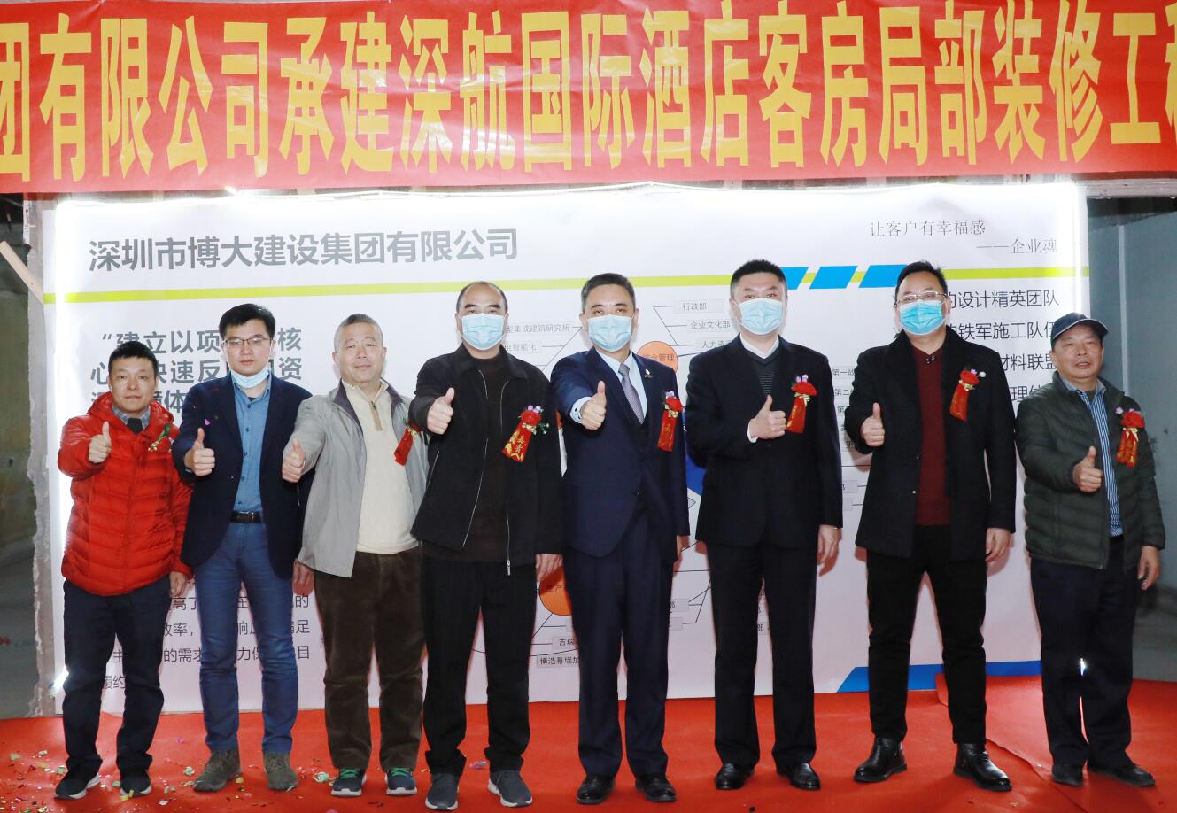2021年1月14日,在開完深航國際酒店客房局部裝修工程第一次工地會議后,集團副董事長黃河、第三戰(zhàn)區(qū)總經理徐朝華與深航基建處副總經理陳新、深航基建處工程管理中心譚波、深航酒店副總經理肖強、深圳市中安項目管理有限公司總經理趙坤強等一行領導參加了深航國際酒店開工典禮剪彩儀式。