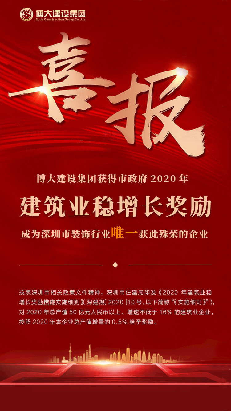 近日,從深圳市住房和建設局傳來喜訊,博大建設集團榮獲深圳市政府2020年建筑業穩增長獎勵,博大是獲此殊榮的唯一一家裝飾企業,當之無愧成為深圳市的行業龍頭,為行業爭光。