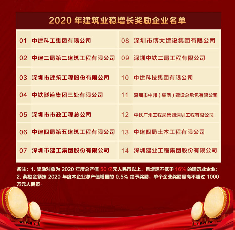 深圳市政府獎勵政策規定:2020年總產值50億元人民幣以上、增速不低于16%的建筑業企業,按照2020年本企業總產值增量的0.5%給予獎勵。博大2020年產值增速遠遠超過政府規定的獎勵標準。